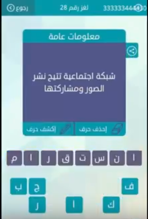 حل اجابة شبكة اجتماعية تتيح نشر الصور ومشاركتها لغز رقم 28 من لعبة وصلة للمجموعة الرابعة صقور الإبدآع